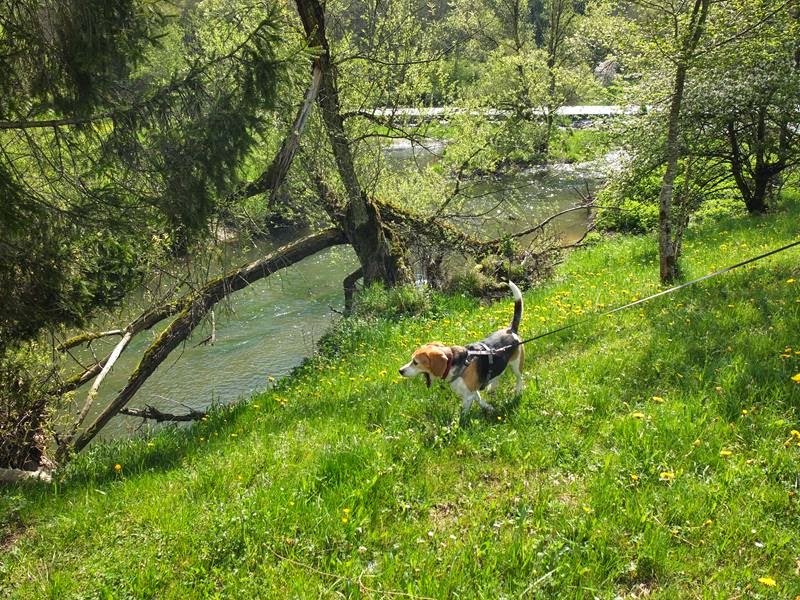 Ich finde aber immer wieder kleine Pfade an der Eyach. Da ist es richtig hübsch. Kein Wunder, dass es meinem Chef hier schon früher gefallen hat. Mit Kindern ist das bestimmt ein schöner, abwechslungsreicher Ausflug! Mit Beagle natürlich auch.